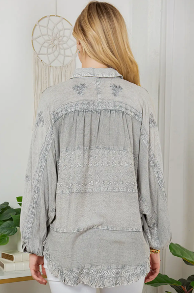 Experience effortless style with the All Things Top, crafted from stonewashed rayon for a soft, vintage feel. Its relaxed fit and shirt collar blend classic structure with boho ease, while long bat sleeves add flowing drama. Patchwork accents and intricate multi-color embroidery create a unique, artistic look, enhanced by delicate frill details for a feminine touch. Versatile and distinctive, this top transitions seamlessly from casual days to evening plans, making every wear a statement of timeless boho charm.