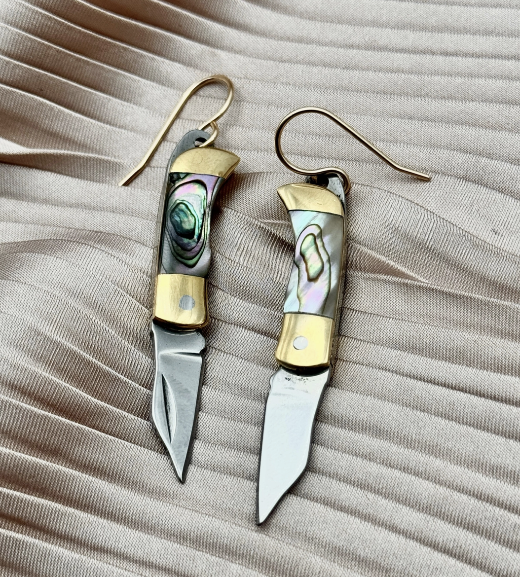 Tiny but mighty, these earrings went viral for a reason! Our Billie Earrings feature a mini working utility tool with a shimmering abalone inlay, They’re functional, statement-making, and impossible not to talk about! Handmade in Idaho for the ones who love a little edge with their shine. 14k gold filled ear wire. Abalone shell colors & patterns vary.
