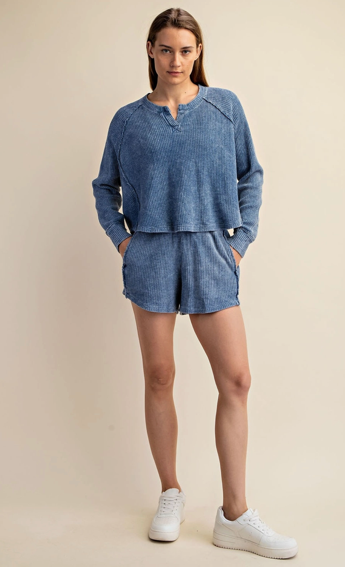 Experience ultimate comfort with the Cobalt Waffle Shorts, crafted from soft mineral-washed cotton waffle fabric. These shorts feature an elastic waistband for a perfect fit and raw edge details that add a trendy, relaxed vibe. Ideal for lounging at home or casual outings, they combine style and ease effortlessly.