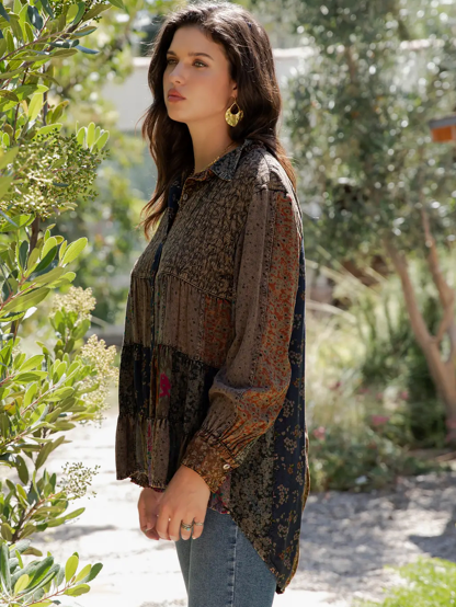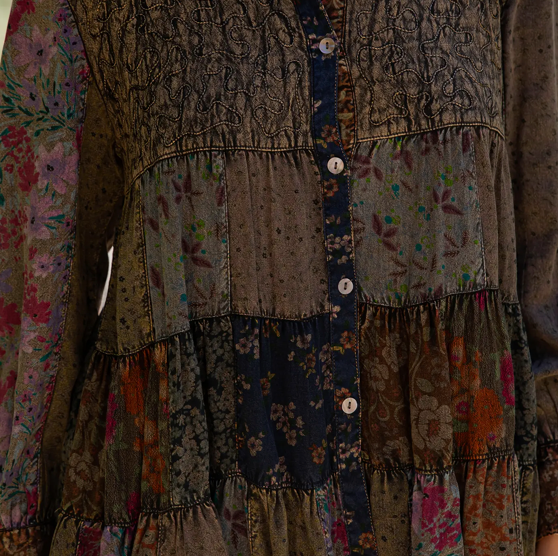 The Conversation Top combines Western-inspired shape with bohemian artistry, crafted from soft rayon featuring mixed prints and patchwork. Its hand-quilted bodice is beautifully enhanced by intricate Aari embroidery, creating a unique vintage charm. Fluid lower tiers add volume and flare, while full sleeves and a mid-thigh length offer versatile layering options. Soft, breathable, and overdyed for a worn-in look, this artisanal shirt pairs effortlessly with jeans or tights for a stylish, standout outfit. Hand wash to preserve its delicate details and handmade quality.