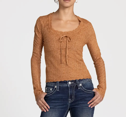 Elevate your wardrobe with the Folk Top, featuring a delicate scallop hem that adds a subtle touch of charm. Crafted from a fine, tight knit, this long sleeve top offers a refined fit and lasting comfort. The feminine bow detail positioned just below the neckline enhances its elegant appeal, making it perfect for both casual outings and dressier occasions. Embrace a stylish, polished look that effortlessly blends comfort with sophistication.
