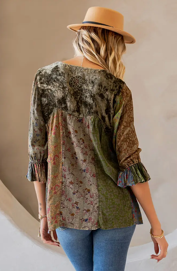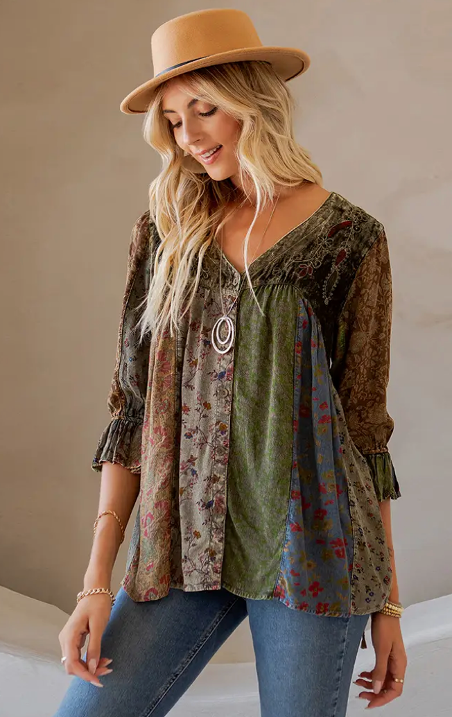 Embrace effortless elegance with the Gotta Be Top, crafted from a breathable lightweight cotton-rayon blend. Its hip-length, flowy silhouette combined with 3/4th sleeves and ruffled hems offers both comfort and style. Intricate Aari embroidery on the yoke showcases artisanal detail, while the button-down front and unique patched flare design add a chic, bohemian flair. Perfect for the free-spirited yet sophisticated, this top promises a one-of-a-kind look with every wear due to its distinctive patchwork. Experience comfort and individuality in every piece.