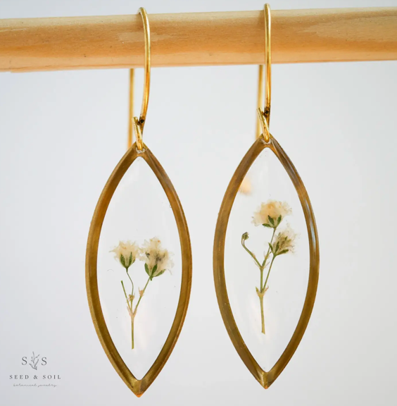 Elevate your style with these Marquise Earrings featuring elegant brass frames suspended from 24k gold plated ear hooks. Each pair showcases real preserved Baby’s Breath, a delicate symbol of purity and grace, making them a meaningful and timeless accessory for any occasion.