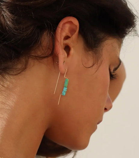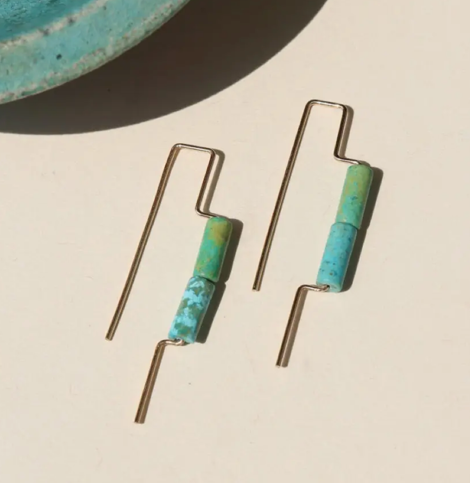 The Mesa Threader Earrings combine sleek geometric design with vibrant blue-green turquoise beads for a modern yet Southwest-inspired look. Crafted with genuine turquoise and 14k gold-filled materials, these lightweight earrings add a striking pop of color to any outfit without sacrificing comfort. Perfect for elevating your everyday style with minimal effort.