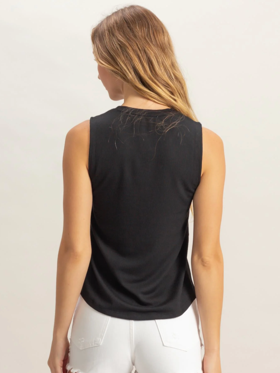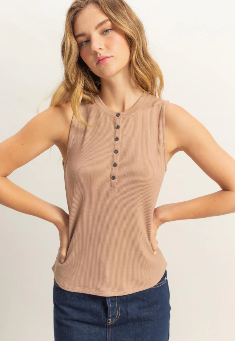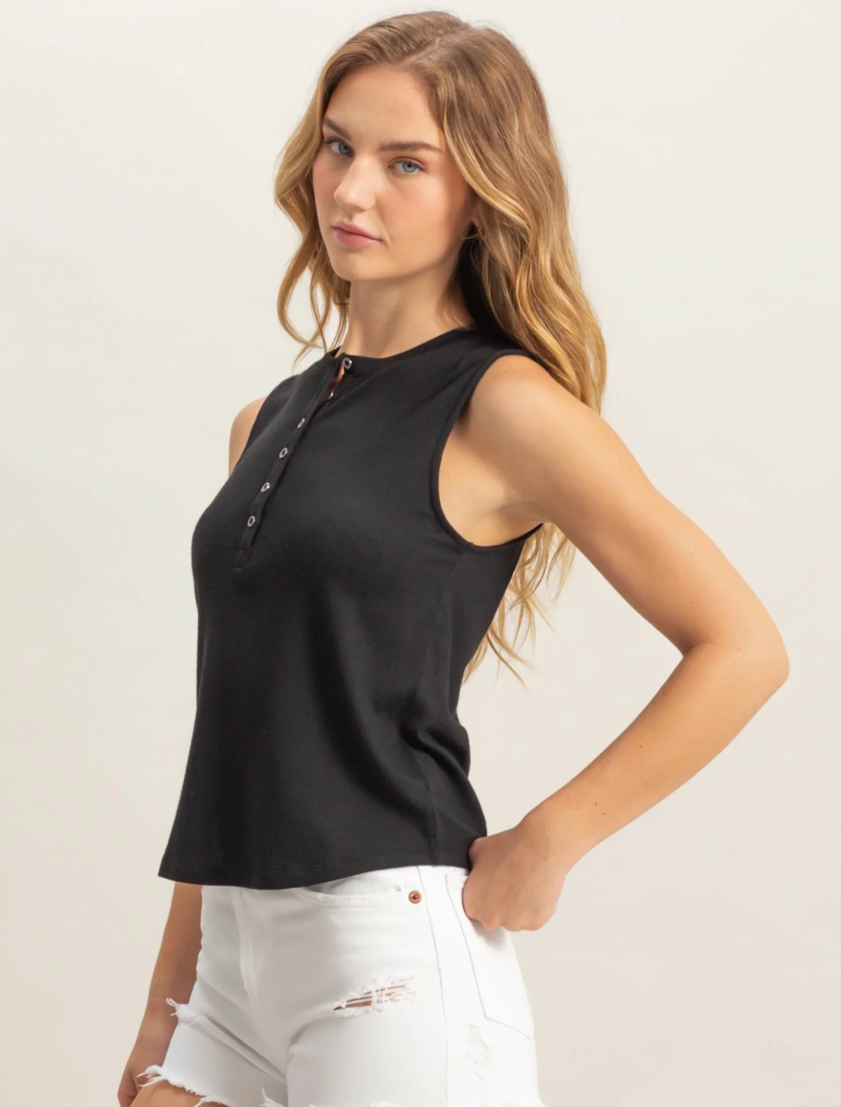 Elevate your everyday style with the Phase Tank, a versatile essential you'll reach for again and again. The sleek round neckline and convenient half snap button placket add subtle sophistication, while the sleeveless design keeps you cool and comfortable. Its snug, flattering fit pairs perfectly with high-waisted jeans for an effortlessly chic look that transitions seamlessly from day to night.