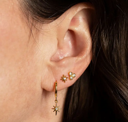 Capture the magic of the night sky with the Starlight Huggie Hoops. These delicate starburst charms dangle from sleek 14mm huggie hoops, offering a subtle yet captivating sparkle. Crafted from 14k gold-plated brass and adorned with shimmering Czech crystals, they add refined elegance whether worn alone or stacked for a minimalist look that shines. Perfect for those who cherish understated beauty inspired by the stars.