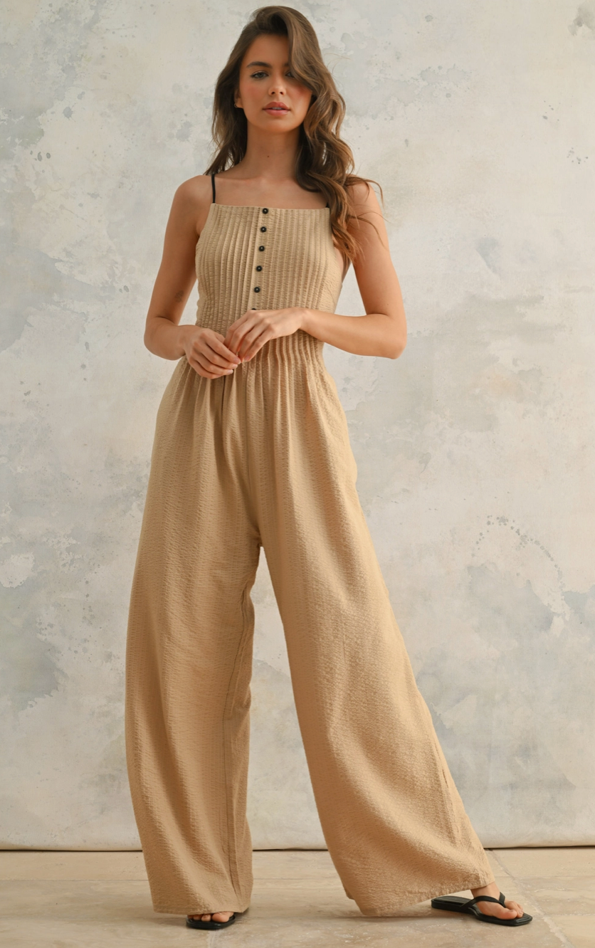 Introducing the Wonders Jumpsuit, made with crinkled fabric for a unique and eye-catching look. The contrasting strap adds a pop of color and style. Effortlessly stand out in this comfortable and stylish jumpsuit.